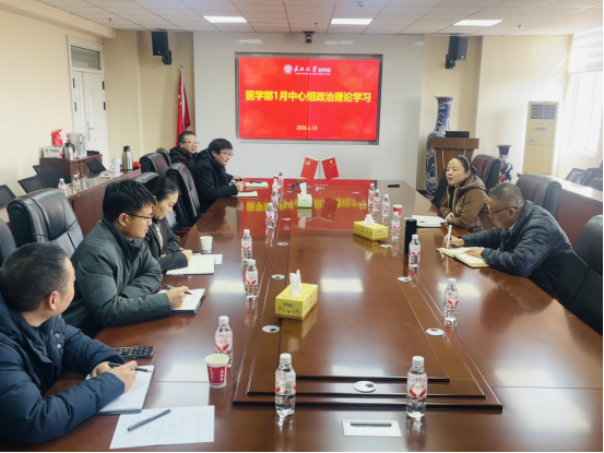 1月13日上午,医学部党委理论学习中心组在14教东502会议室召开2026年1月政治理论学习,会议由医学部党委书记黄群俊主持。